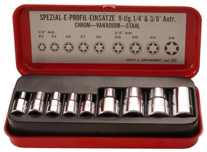 - Original SEK Japan- alle Teile aus Chrom-Vanadium-Stahl- verchromt- für Spezial E-Profil-Schrauben- 1/4" Antrieb = E4-5-6-7-8- 3/8" Antrieb = E10-12-14-16In Metallkassette Artikelnummer : 2037