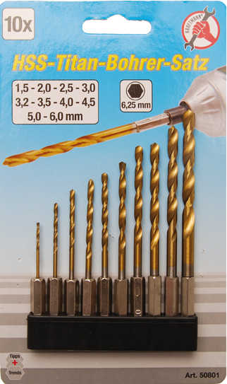 - Bohrerdurchmesser: 1,5 - 2,0 - 2,5 - 3,0 - 3,2 3,5 - 4,0 - 4,5 - 4,8 - 5,0 5,5 - 6,0 - 6,5 mm - Material: HSS-Stahl - in Aufbe