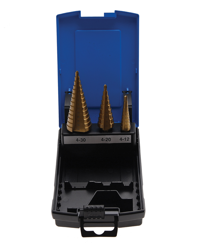 - Stufen: 6 - 8 - 10 - 12 - 14 - 16 - 18 - 20 - 22 - 24 - 26 - 28 - 30 mm - aus HSS 6542 gefertigt - Nitrid beschichtet