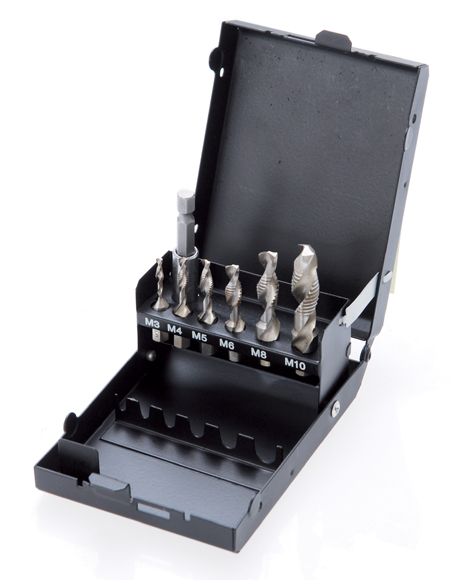 - 1 magnetischer Bithalter - 6 Kombibohrer M3 x 0,5 - M4 x 0,7 - M5 x 0,8 - M6 x 1,0 M8 x 1,25 - M10 x 1,5 - Alles in einem Arbeitsgang: 1. Bohren des Kernlochs 2. Gewinde schneiden 3. Entgraten und Senken