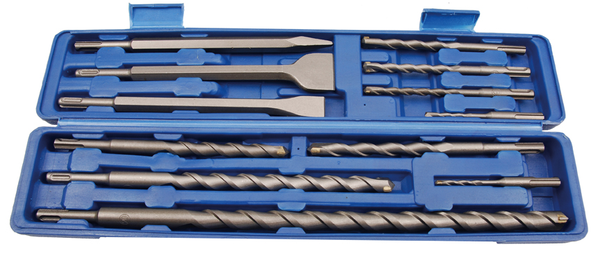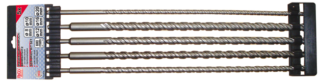 - mit SDS Aufnahme - 9 Bohrer in unterschiedlichen Längen und Größen: 5 mm (110 mm lang), 6 mm (110 mm lang) 8 mm (160 mm lang), 10 mm (160 mm lang) 12 mm (160 mm lang), 14 mm (200 mm lang) 16 mm (210 mm lang), 18 mm (300 mm lang) 20 mm (