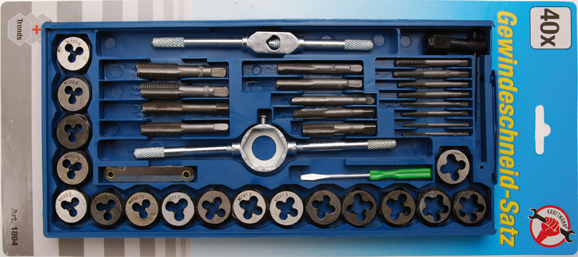 - 17 Hand-Gewindebohrer und 17 Schneideisen für Grobgewinde: M3 x 0.6 - M4 x 0.75 - M5 x 0.9 - M6 x 1 - M7 x 1 M8 x 1.25 - M10 x 1.5 - M12 x 1.75 Feingewinde: M3 x 0.5 - M4 x 0.7 - M5 x 0.8 - M6 x 0.75 - M7 x 0.75 M8 x 1, M10 x 1.25 - M12 x 1.5 - sowie 1/8" NPT27 - 1 verstellbares Windeisen - 2 Schneideisenhalter - 1 Gewindefühlerlehre - 1 Schlitzschraubendreher in Plastik-Sichtk