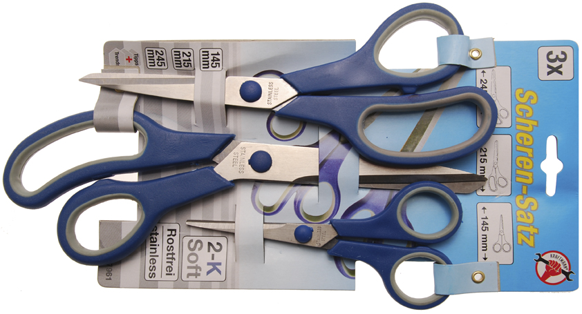 best. aus :- Schneiderschere 245 mm- Haushaltsschere 215 mm- Näh- u. Auftrennschere 145 mm- mit 2-farbigen „Soft-Touch“ Griffen Artikelnummer : 7961