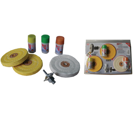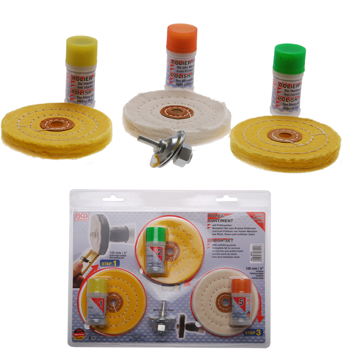- Komplett-Set zum Kratzer-Entfernen und zum Polieren von harten Metallen wie Stahl, Edelstahl und Eisen - 3 Polierscheiben (2x fest, 1x medium) - mit Bohrfutterdorn - mit 3 Polierpasten speziell für harte Metalle