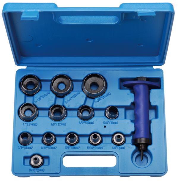 - 13 auswechselbare Locheisen - 5-6-8-10-11-13-16-19-22-25-28-32-35 mm - 1 Schnellwechsel-Locheisenhalter mit ergonomischem Griff und federgelagertem Zentrierdorn - geeignet für Papier, Kunststofffolie und Gummi - ideal zum Lochen von Papier-Dichtungen