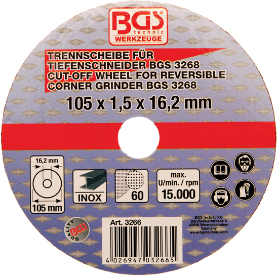 - geeignet für Druckluft-Trennwerkzeug BGS 3268 - Scheibendurchmesser: 105 mm - Scheibenstärke: 1,5 mm - Aufnahmebohrung: 16,2 mm